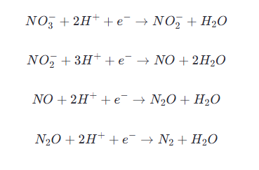 反硝化作用是由异养型细菌在缺氧或厌氧条件下完成的,它们使用硝酸盐或亚硝酸盐作为电子受体,将它们还原为氮气,同时将有机物作为电子供体: